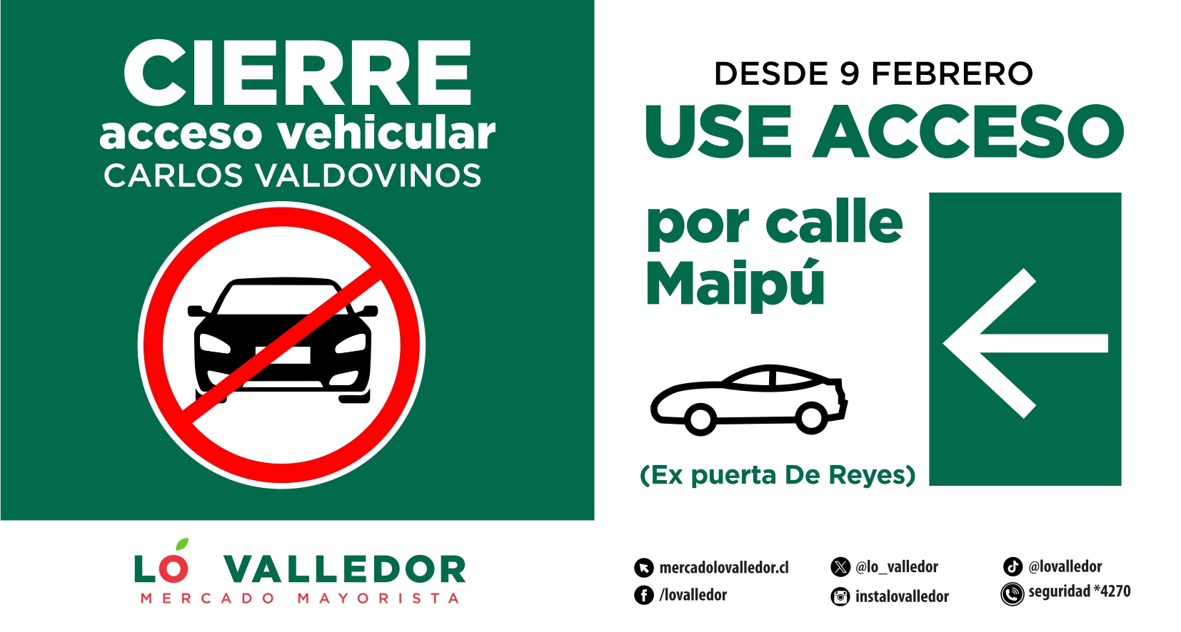 El Mercado Mayorista Lo Valledor informa a locatarios que el ingreso por Avenida Carlos Valdovinos dejó de funcionar. En su lugar ese invita a acceder por la Puerta Maipú (Ex de Reyes), ubicada en Avenida Maipú.