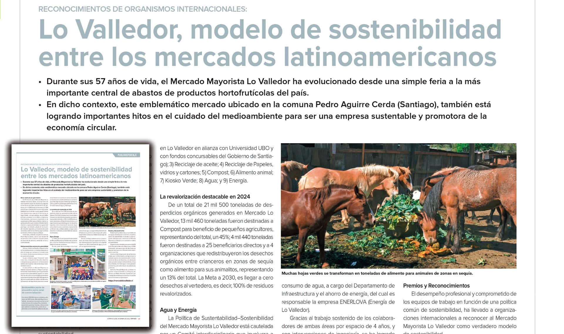 En el publirreportaje de Sustentabilidad 2024 y Proyecciones 2025 del Diario Financiero, se destacan las iniciativas de Lo Valledor para reducir su huella de carbono y revalorizar los desperdicios generados en su actividad comercial en los patios. A través de nueve programas clave, el mercado se compromete a promover la sostenibilidad en todas sus operaciones.